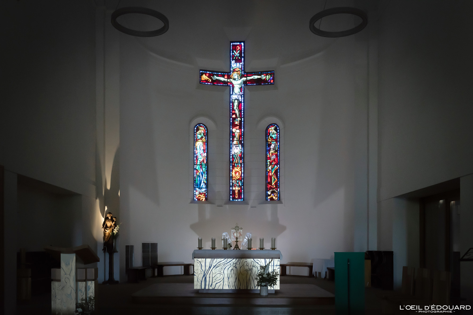 Dans les alentours, je n’ai pu m’empêcher d’aller jeter mon œil dans l’église paroissiale Notre-Dame d’Émeraude. Édifiée en 1858, elle signe la délocalisation du centre religieux de Dinard, près du Prieuré. Si, mis à part la forme de la flèche, l’extérieur est assez classique, l’intérieur est plus attrayant avec un plafond lambrissé et son orgue aux lignes épurées et franches. Mais ce sont les vitraux modernes polychromes qui m’ont le plus marqué, œuvre du maître-verrier Max Ingrand qui a également œuvré dans la cathédrale Saint-Vincent de Saint-Malo.