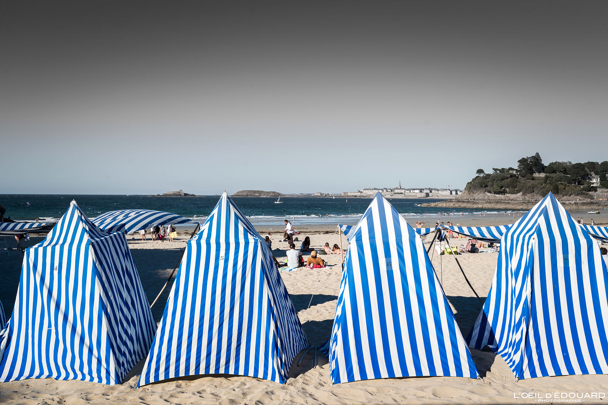 La plus grande et célèbre est la plage de l’Écluse, idéalement située sur le parvis du centre de la station balnéaire qui s’est développé autour d’elle. En plus de la foultitude de vacanciers, cette large crique recouverte de sable doré est agrémentée d’iconiques tentes rayées bleu et blanc, de transats en location ainsi que de cabines en dur comme on peut en voir à Deauville notamment. Tout à sa droite, au pied de la pointe du Moulinet, une piscine naturelle (comme on peut en trouver à Saint-Malo et Cancale), ou plutôt « piscine de mer » car artificiellement fermée par un muret et qui se remplit naturellement à marée haute. Outre le fait d’une surface calme pour nager, l’avantage est que cela permet à l’eau d’être plus chaude. Autour du bassin, une terrasse de bar prenant les derniers rayons et donc très prisée pour un dernier bain… de soleil.
