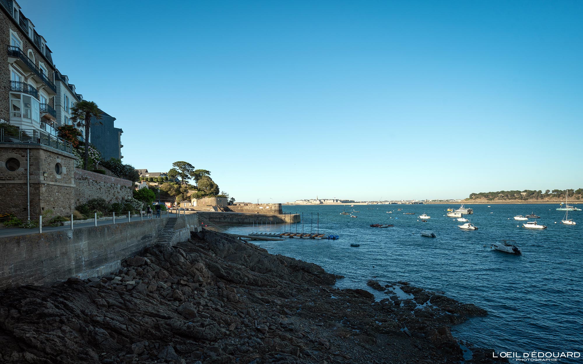 Au départ de la plage de l’Écluse, le chemin de ronde de la Malouine serpente par-dessus les rochers et en contrebas des villas Belle Époque. Le sentier littoral donne presque l’impression de marcher sur l’eau et permet d’admirer la vue au lointain. On peut apercevoir les îlots émergés comme l’île Harbour au premier plan puis l’île de Cézembre et le rocher Saint-David ainsi que le phare du Grand Jardin. Petit conseil entre amis, venez en fin de journée sur l’un des belvédères situés juste au-dessus (cf : ma carte) pour vous délecter du coucher de soleil incandescent sur l’horizon marin.