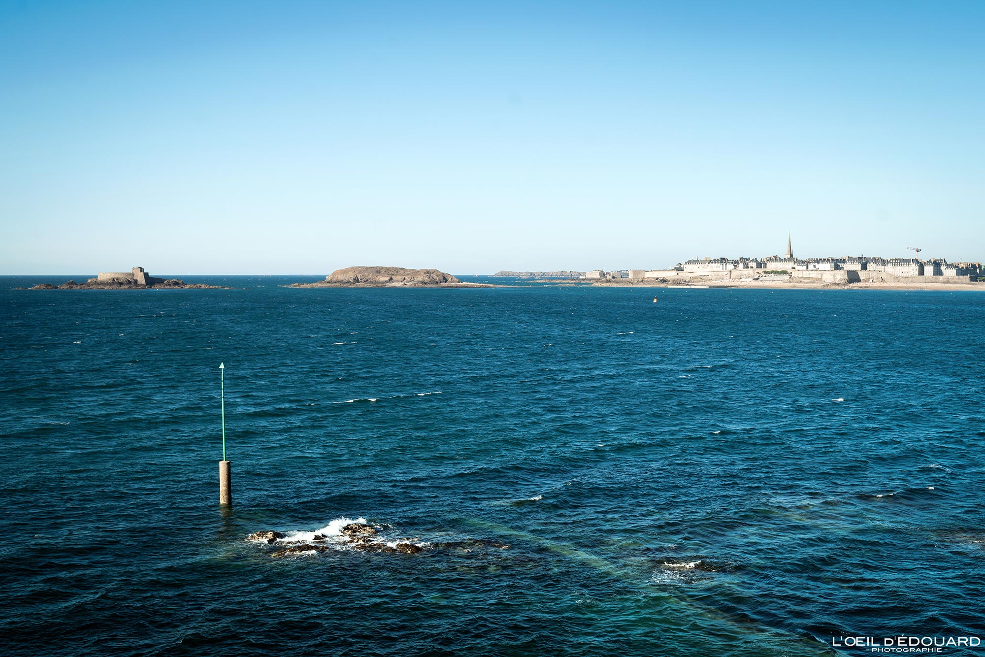 Le chemin de ronde du Moulinet part de la piscine naturelle de la plage de l’Écluse pour la contourner à ses pieds. Pour ma part, j’ai directement monté la rue Coppinger pour pouvoir voir les villas Belle Époque de ce quartier de même que pour avoir un point de vue dominant sur l’étendue sableuse et la pointe de la Malouine. De toute façon, les itinéraires se rejoignent juste après, au niveau d’un belvédère depuis lequel on a une vue directe sur la ville close de Saint-Malo émergeant de ses remparts ainsi que sur les îles du Petit Bé avec son fort et du Grand Bé. Au loin, l’île et le fort de la Conchée.