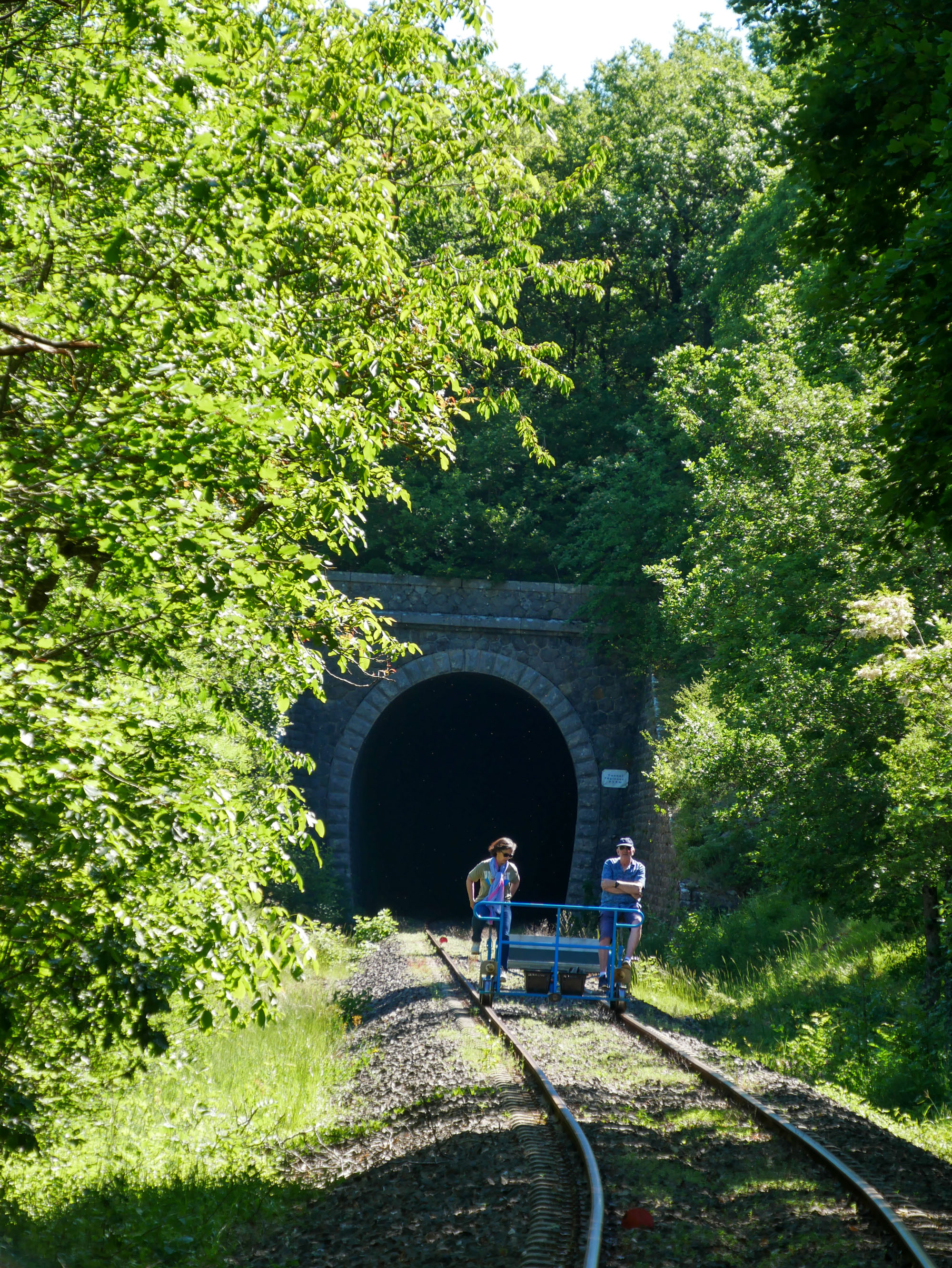 • C’est parti pour 8 km à parcourir à la force de nos mollets, sans aucun effort car la voie ferrée n’est quasiment que descente. En fait, on passe plus de temps à freiner qu’à pédaler. On freine pour garder une distance de sécurité avec l’équipage devant nous. On freine évidemment pour s’arrêter et mitrailler le village de Saint-Eulalie-de-Cernon. Le reste du temps, on se laisse porter par la découverte, ponctuée de viaducs et de tunnels.