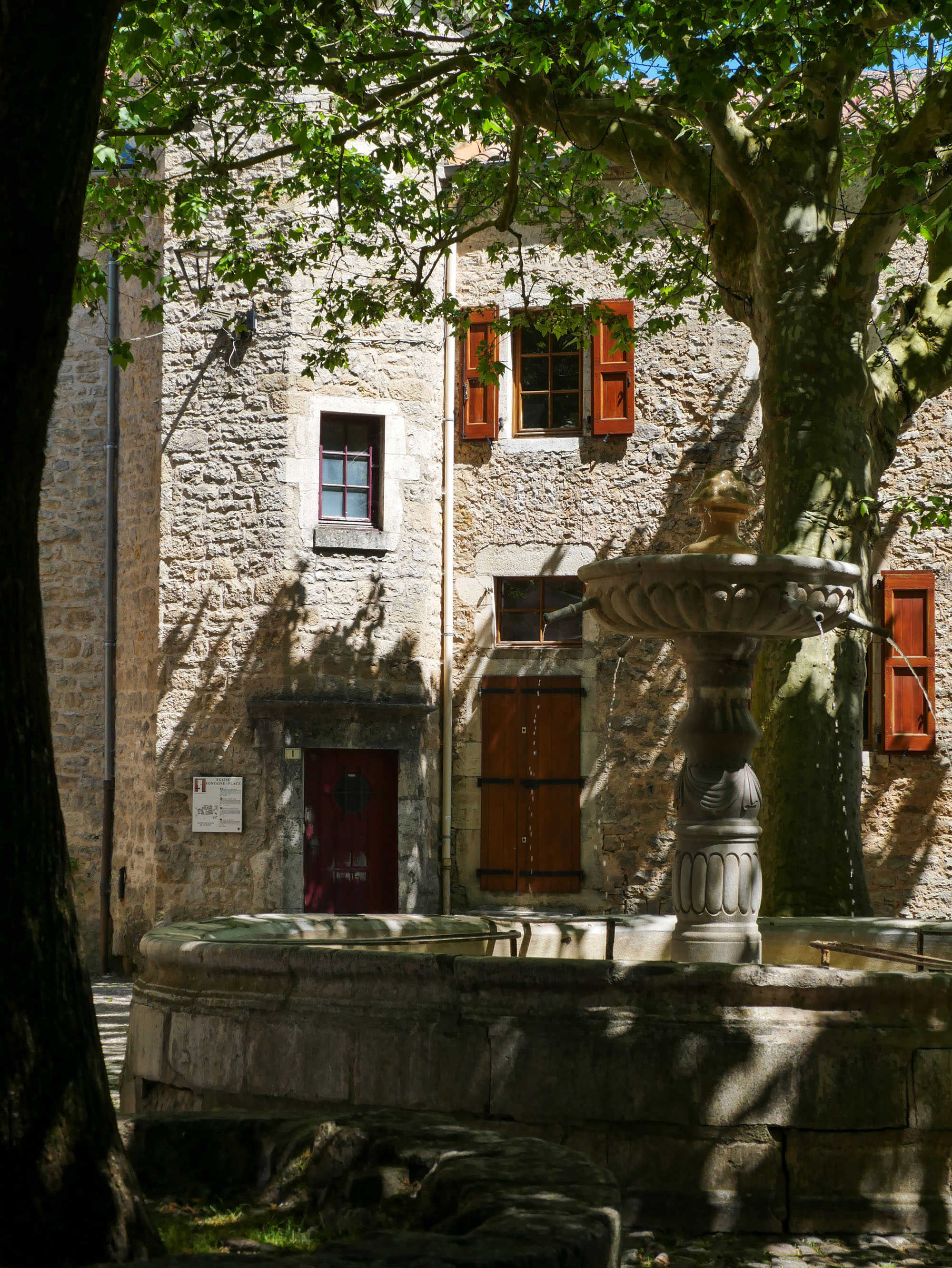 C’est mon petit coup de cœur ce village adorable avec ses ruelles resserrées qui convergèrent toutes vers une petite place. J’avais l’impression de me retrouver dans le Midi de la France avec les platanes qui apportent une fraicheur bienvenue en cette fin mai déjà très (trop) chaude, la jolie fontaine qui glougloute, le café, l’église. Un petit coin de paradis à l’abri des regards qui me fait dire que les Templiers-Hospitaliers savaient dégoter les meilleurs endroits pour s’installer !