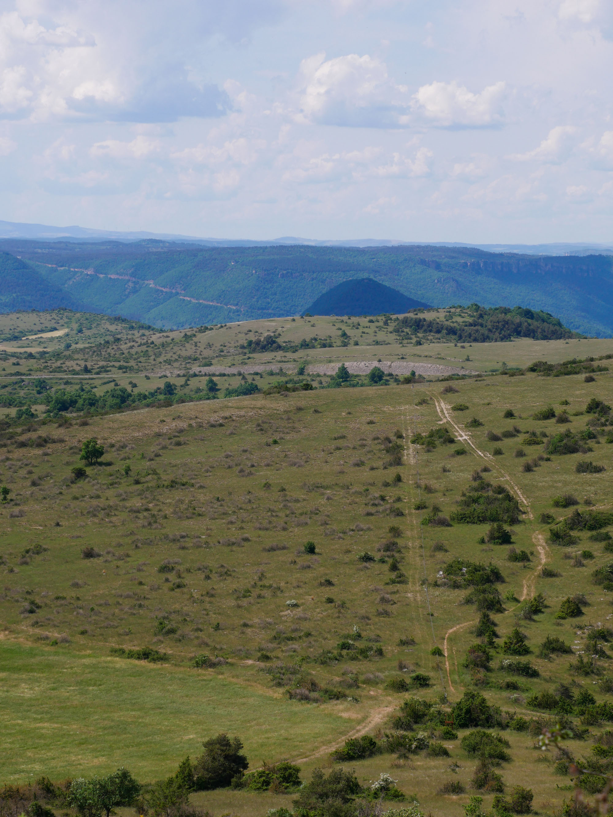 Les quelques passages en sous-bois sont appréciables. Nous sommes fin mai mais le soleil cogne comme en plein été. Mais le plus remarquable ce sont les panoramas grandioses sur le Parc naturel régional des grands causses qui se dévoilent au fil du parcours.