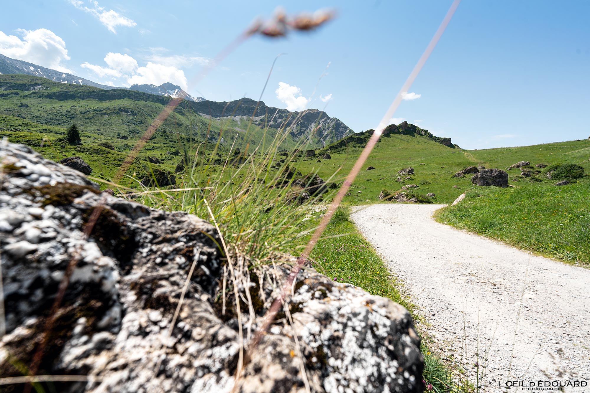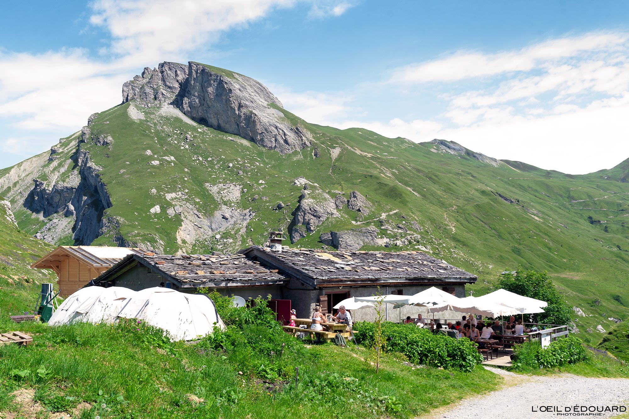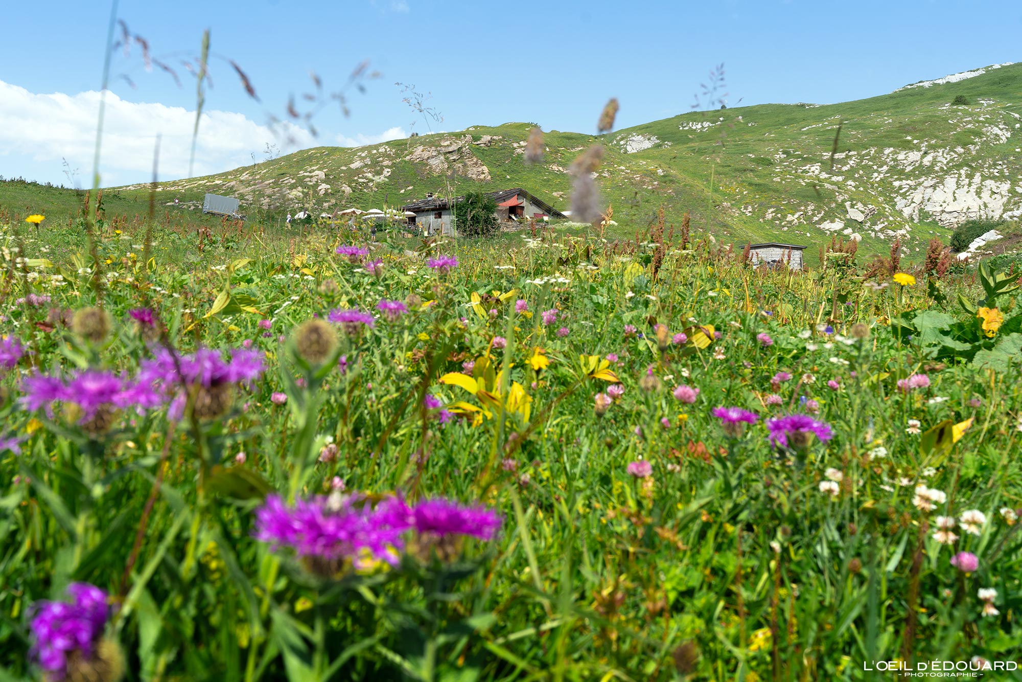 S’en suit un vaste plateau herbeux où quelques lapiaz affleurent et où les tarines sont en pâture. En début de saison, les fleurs de montagne subliment la prairie d’alpage avec leurs touches de couleurs : rose des joubarbes, blanc des pâquerettes, violet des raiponces et des campanules, jaunes des benoîtes, pourpre des rumex… On suit alors tranquillement la piste carrossable où l’on croise des randonneurs avec gros sacs à dos et matelas-mousse (eux, font le Tour du Beaufortain). Derrière la butte rocheuse, on atteint le chalet de Mora. Les trekkeurs poursuivent en direction de la Petite Berge (décollage possible de vol en parapente) tandis que l’itinéraire de randonnée pour la cabine téléphonique anglaise part ici à droite, sur un petit sentier derrière la maison. 200 mètres plus loin, on atteint le belvédère, à 1889 m d’altitude, 20 minutes après le départ du parking du plan de la Lai.