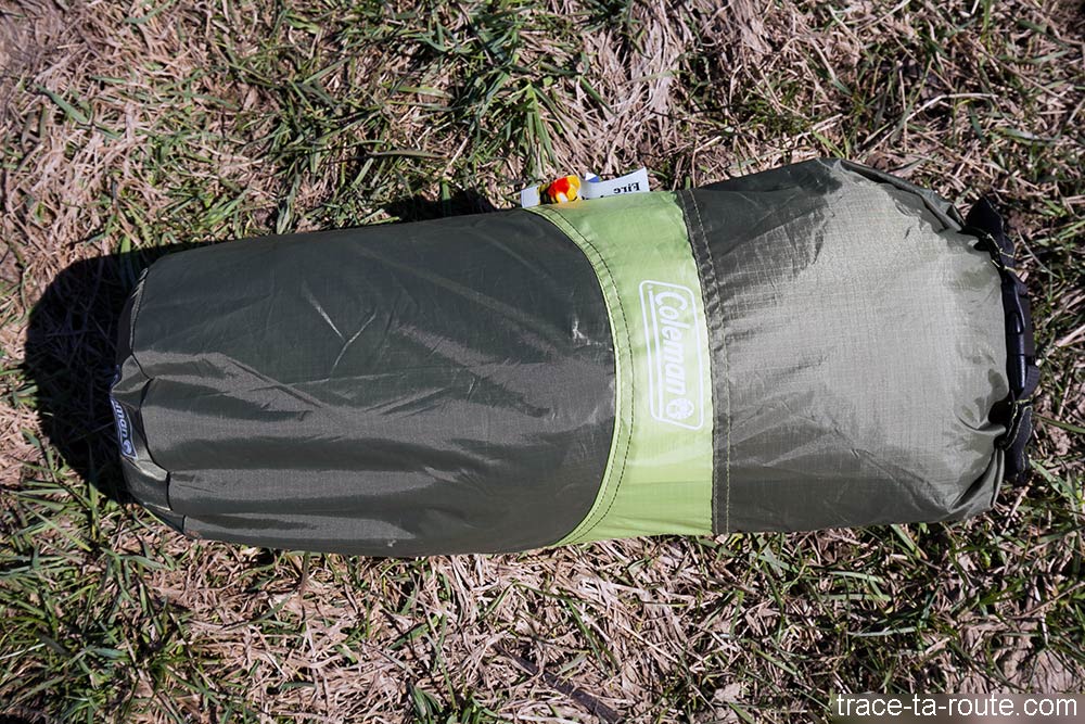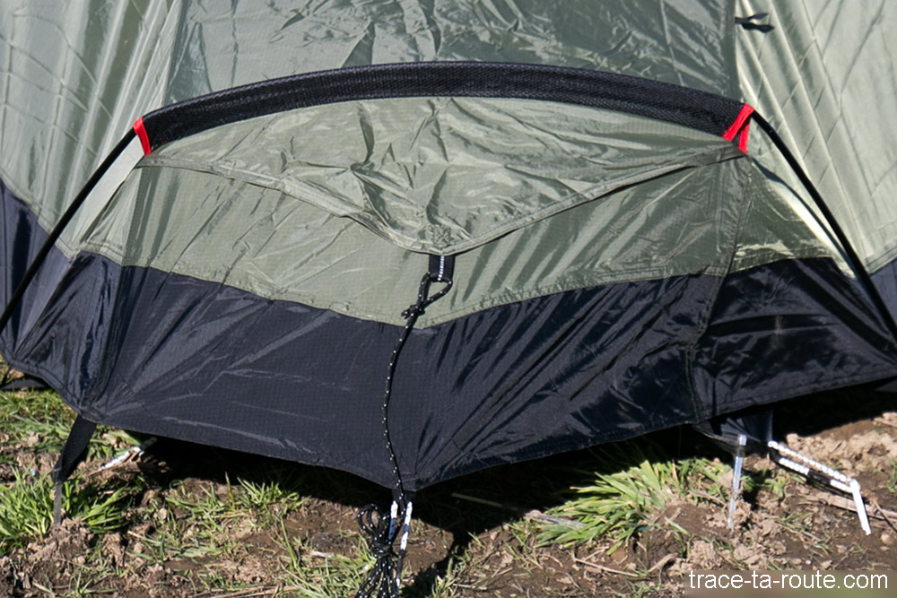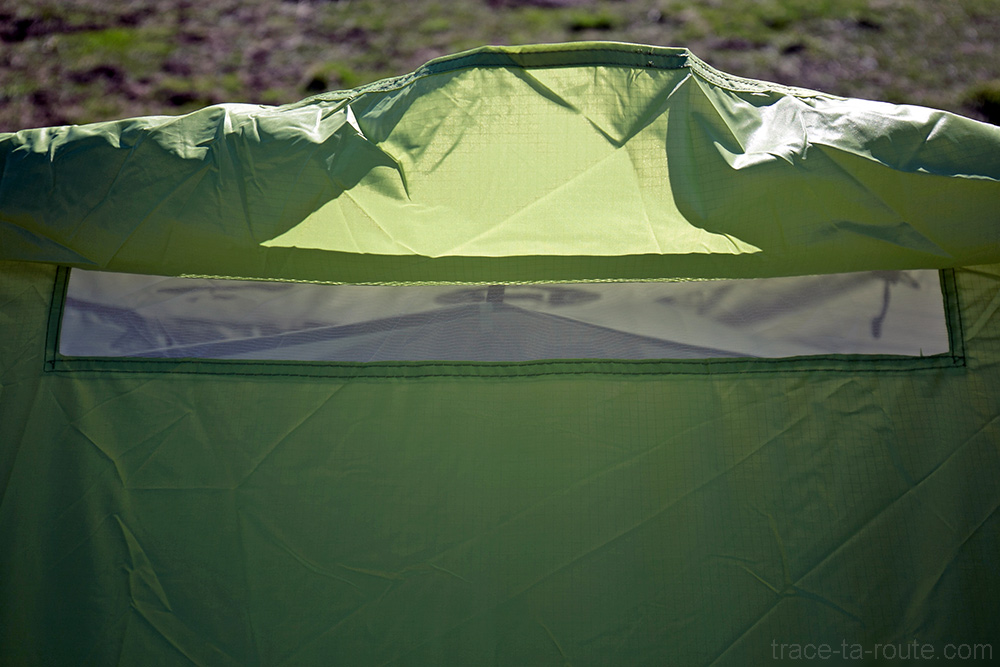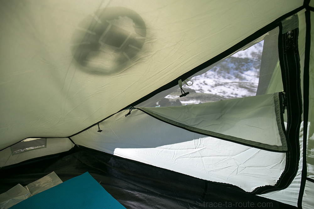 Je n’ai pas encore testé sa gestion de la condensation (les petites gouttelettes d’humidité qui se forment au contact de la toile) ni son imperméabilité (vu son poids, ce n’est pas une tente destinée aux grands treks aventureux et, pas maso, je ne l’ai utilisée que quand il faisait beau. ça se tient comme approche, non ?) mais là encore, la colonne d’eau annoncée de 4000 mm présage d’une étanchéité très satisfaisante (ce sont les mêmes données que pour une veste hardshell (type gore-tex par exemple).