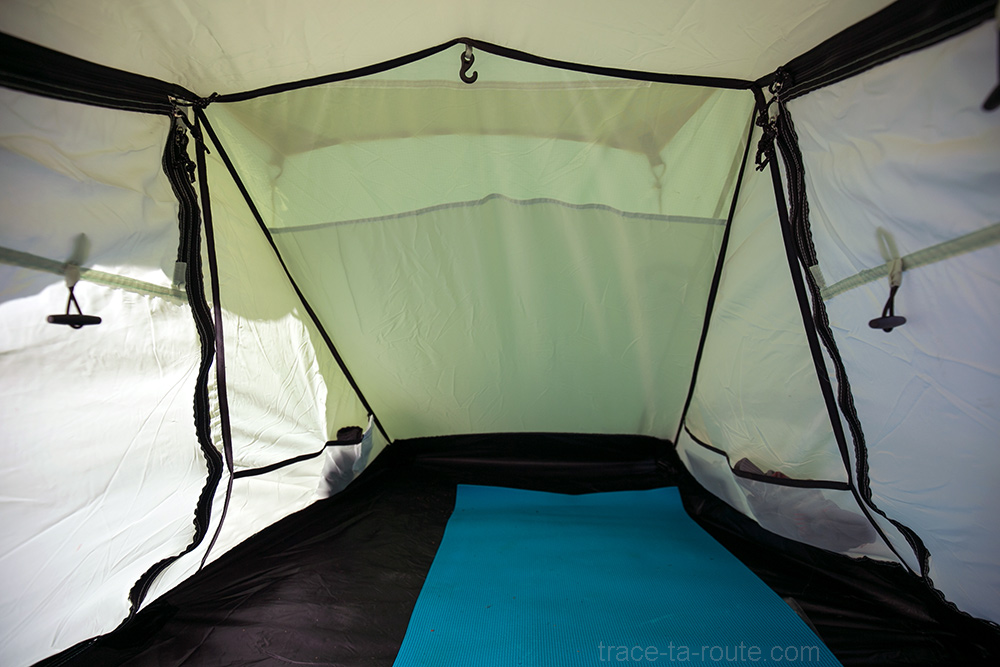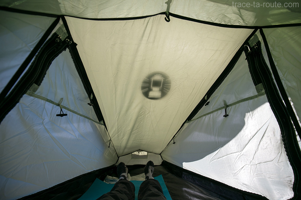 Du coup, l’espace intérieur à proprement parler n’est pas encombré et on profite pleinement du volume. La longueur est vraiment confortable et on peut facilement y placer d’autres choses (matelas et duvet évidemment mais aussi vêtements, objets sensibles etc…). Le test a été réalisé à deux et, très honnêtement, on ne s’est absolument pas “marché” dessus (si tant est qu’on eut été somnambules). À l’intérieur, classique, un crochet pour suspendre un lampe, 2 x 2 poches pour les effets personnels (clés, téléphone, lunettes…). En plus des moustiquaires sur les portes, on en retrouve deux autres au niveau des pieds et au-dessus de la tête pour la ventilation.