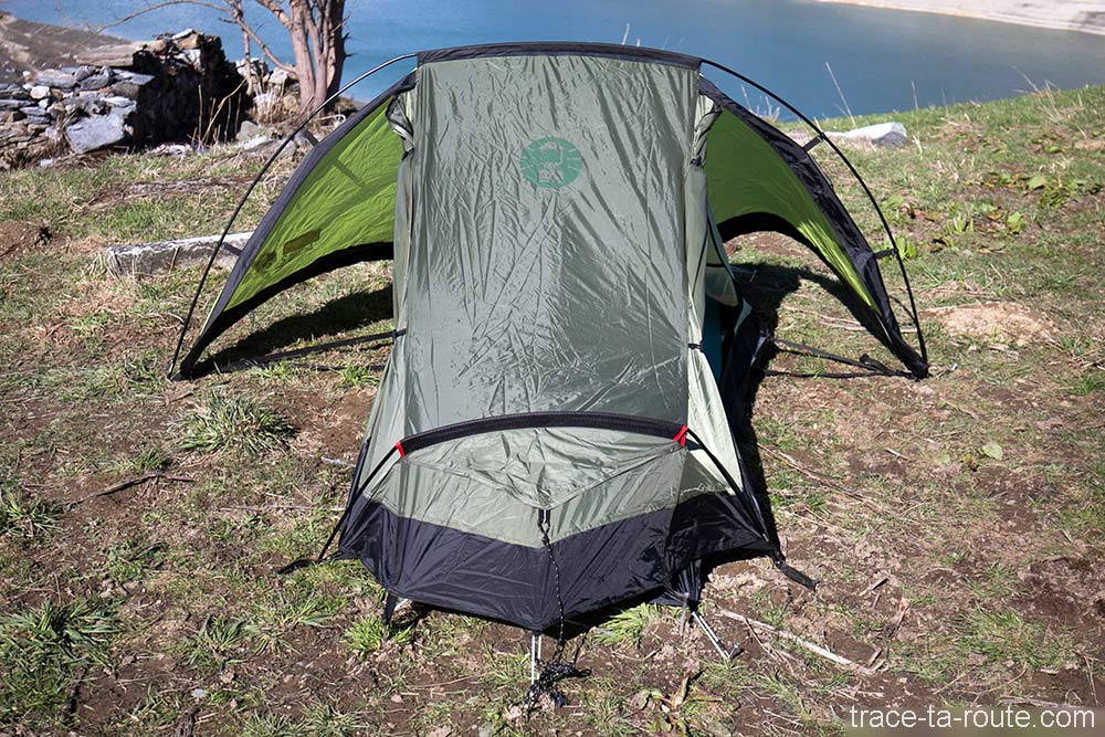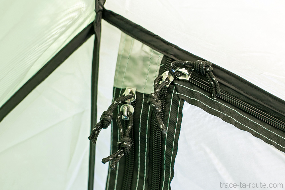 Un des atouts appréciables chez la tente Coleman Aravis est qu’elle dispose de deux ouvertures latérales qui permettent à chacun d’aller et venir à son gré, sans avoir à enjamber l’autre (ce qui est très pratique, vous y avez tout de suite vous aussi, pour le petit pissou au milieu de la nuit). De plus, l’espace est donc doublé et chacun peut “ranger” ses affaires dans son côté : chacun son abside et les tarines du Beaufortain ont été bien gardées ! Accessoirement, ça peut être très utile aussi pour ventiler lors d’utilisations estivales, avec notamment les moustiquaires sur chaque porte intérieure. Le zip d’ouverture est facile d’utilisation même si la toile, classique, a tendance à se prendre de dedans par moment (un bon placement de l’index résout le problème). Pour fixer la porte, on enroule la toile sur elle-même et on l’attache avec les petits bâtonnets.