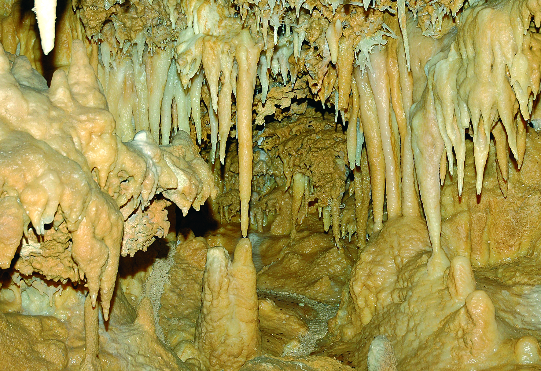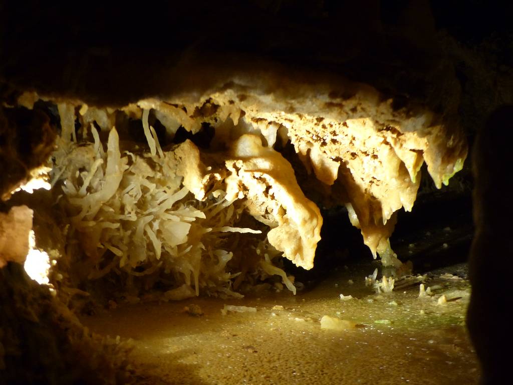 La particularité de cette grotte ? Sa concentration exceptionnelle d’excentriques, des concrétions géologiques qui se jouent des lois de la gravité pour pousser littéralement dans tous les sens. Le résultat ? Une toiles d’araignée minérale et fragile qui brille et scintille grâce à un habile jeu de mise lumière.