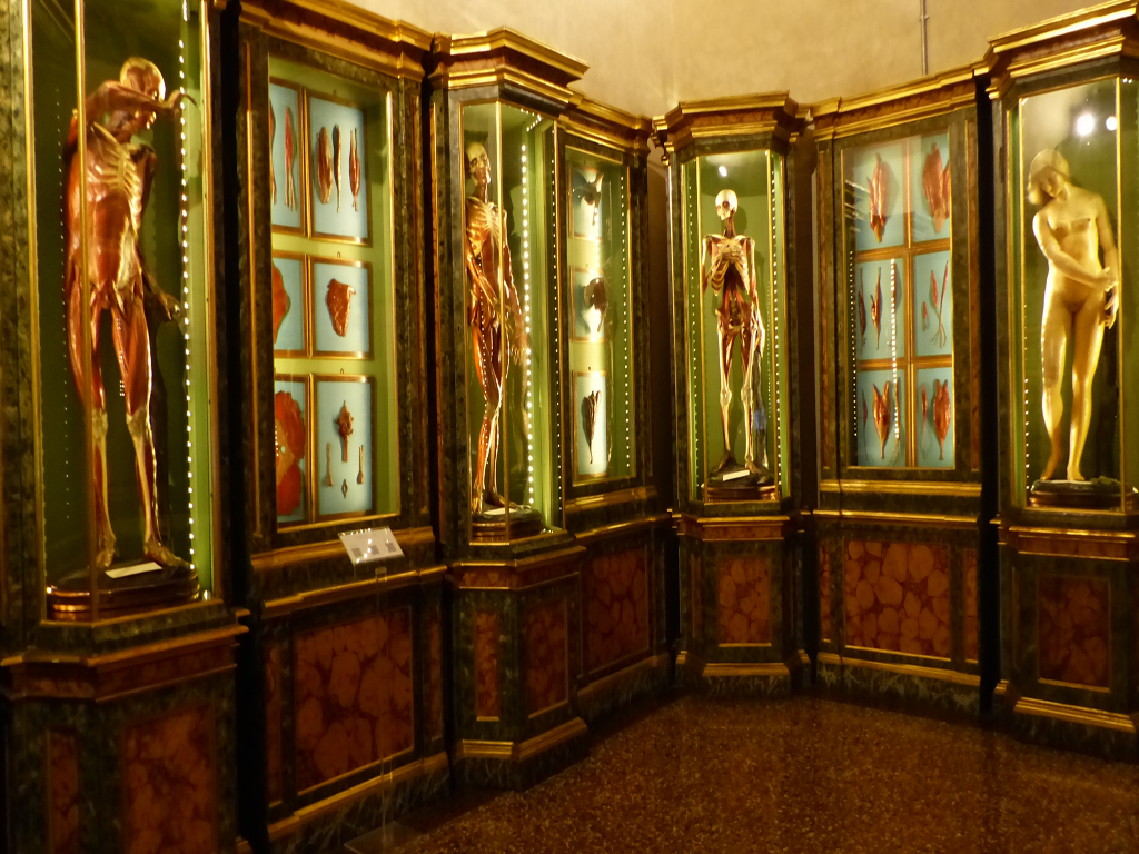 “Bologna la  Dota” car elle renferme une des plus vieilles universités d’Europe. C’est au Palazzo Dotti situé justement dans le quartier des universités qu’il faut se rendre pour comprendre l’ampleur du rayonnement intellectuel de la ville.  Il abrite une collection universitaire bizarre et hétéroclite quoique très bien rangée par grande discipline scientifique : l’anatomie avec ses moulages d’utérus, de fœtus difformes mais aussi ses cires anatomiques qui nous livrent sans aucune censure, ni aucun filtre, viscères, organes et autres squelettes. La section d’histoire naturelle elle ressemble un peu à un cabinet de curiosités. On y retrouve des bestioles figées dans du formol et difficilement identifiables, des peaux de serpents géants, des œufs d’on ne sait trop quel oiseau … Ensuite place aux maquettes de bateaux en tout genre et à l’art militaire… Quand je vous parlais d’éclectisme !